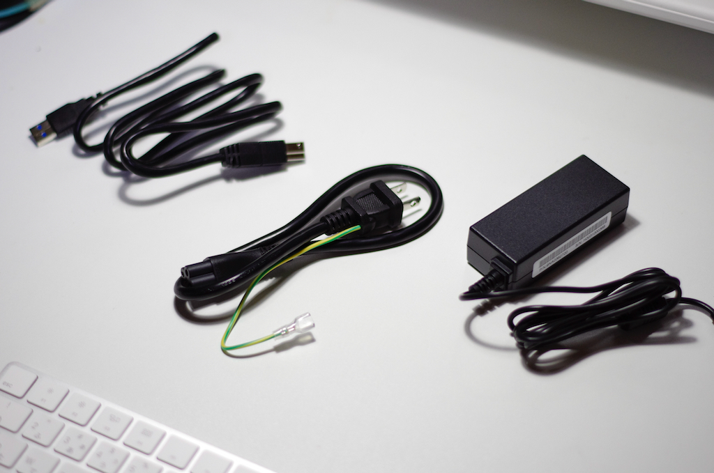 USBケーブル、電源ケーブル、ACアダプターと取説(写ってないけど)。