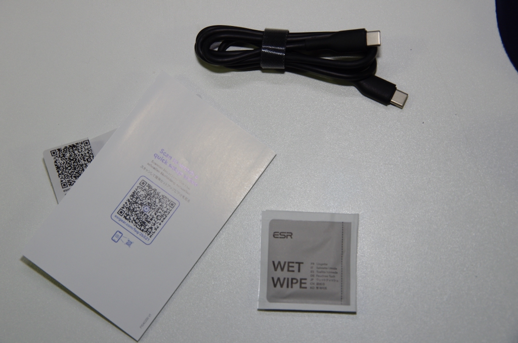 USB-Cケーブルと、説明書とクリーニングクロス(WETとDRYのワイプ)。